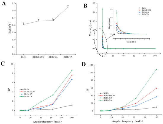 EAI is the ability of proteins or other emulsifiers to adsorb onto the surface of newly formed droplets, and this ability reduces the interfacial tension between the oil and water phases, thereby stabilizing the emulsion [34]. The EAIs of the three complexes are shown in Figure 5A. Compared with bovine liver hydrolysates, the EAI was significantly increased, and the emulsification activity index (EAI) of the mixed group showed BLHs-TA > BLHs-GA > BLHs-EGCG > BLHs, which indicated that the interaction of EGCG\TA\GA with bovine liver hydrolysates facilitated the increase in the EAI, which might be related to the exposure of aromatic amino acids of the bovine liver hydrolysates after their modification by polyphenols and the unfolding of the peptide chain [39]. The flexibility of peptide/protein hydrolysates may be enhanced when combined with polyphenols, and such complexes may be more effective in reducing the surface tension of emulsion droplets [40]. Some studies have shown that silk gum protein hydrolysates covalently coupled with quercetin or rutin have higher emulsifying activity [41]. Similar findings were found in the emulsion system stabilized by the proanthocyanidin–soybean meal hydrolysate coupling [19]. Thus, bovine liver hydrolysates in the form of polyphenol complexes possess some potential to enhance emulsification properties, while similar conclusions can be drawn under optical microscopy.