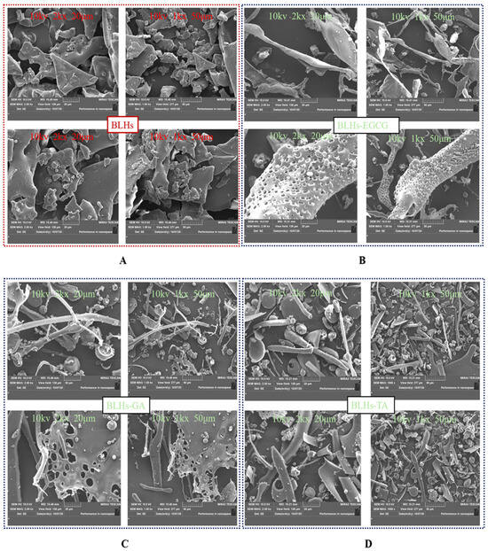 SEM images of BLHs and BLHs-EGCG, BLHs-GA and BLHs-TA are shown in Figure 6. In the control BLHs, it was observed that BLHs showed a lamellar shape with a roughened surface of the matrix, and relatively large volume, and many aggregates with thick walls were observed, whereas the structure of BLHs-EGCG, BLHs-GA and BLHs-TA was looser, which indicated that the structure of BLHs was damaged to some extent due to the interactions with the different polyphenols and the formation of new complexes [47]. BLHs-EGCG, BLHs-GA and BLHs-TA all have higher fragmentation rates than BLHs, and BLHs-EGCG exhibits an overall dendritic structure with small globular objects attached to it. BLHs-GA and BLHs-TA exhibit globular and rod-like structures, and similar structural disruptions were observed in the covalent binding of wheat gluten hydrolysates to chlorogenic acid, both of which together formed rod-like or globular structures. Among them, BLHs-TA is the most compact, while BLHs-GA is relatively sparse, which is related to the structural differences in polyphenols [26]. This is similar to the structural compactness observed by Zhao et al. when they studied the interaction of casein with tannic acid and gallic acid, respectively [45].