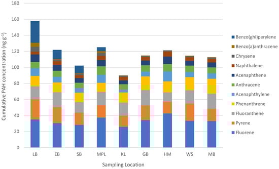 To discern the potential source of coastal PAH contamination, the total concentrations of low-molecular-weight (LMW) PAHs (<4 aromatic rings) were compared with the total concentration of high-molecular-weight (HMW) PAHs (≥4 aromatic rings) [5,66]. The LMW PAHs within the current research were naphthalene, acenaphthylene, acenaphthene, fluorene, phenanthrene, and anthracene, while the HMW PAHs were fluoranthene, pyrene, benz(a)anthracene, benzo(ghi)perylene, and chrysene. The PAH with the highest concentration in wild mussels was fluorene (Figure 2), and the total LMW PAH concentrations were 1.7 times higher than the total HMW PAH concentrations. When looking at LMW/HMW PAH ratios for individual locations, LMW PAHs were dominant in Mouille Point, Kommetjie, Gordon’s Bay, Hermanus, and Mossel Bay, and HMW PAHS were greater in Lambert’s Bay, Eland’s Bay, Saldanha Bay, and Witsand. Locations with greater concentrations of LMW PAHs indicate that pollution is largely coming from petrogenic sources (i.e., fossil fuels), while those with more HMW PAHS likely come from more pyrolytic sources (i.e., incineration processes) [5,67,68].