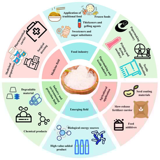 Rice starch holds significant application value in both traditional industries and emerging fields due to its tunable linear-to-branched chain ratio and ease of chemical or physical modification (Figure 2) [27].