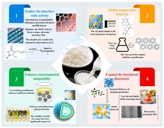 Emulsion technology offers a comprehensive approach to overcoming the functional limitations of rice starch by means of interfacial engineering and molecular structure modification. Core strategies include enhancing interfacial activity, inhibiting retrogradation, improving environmental adaptability, and expanding functional attributes (Figure 3). The specific implementation pathways are outlined below.