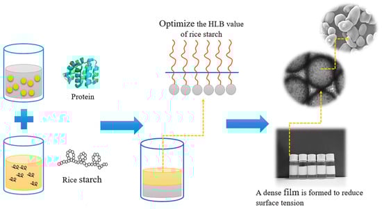 By introducing amphiphilic substances (e.g., proteins) or through chemical modifications such as esterification and etherification, emulsion technology can optimize the hydrophilic–lipophilic balance (HLB) of rice starch, enabling stable adsorption at the oil–water interface and the formation of a compact interfacial film that reduces interfacial tension (Figure 4) [8]. For instance, rice starch modified with octenyl succinic anhydride (OSA) exhibits significantly enhanced hydrophobicity and emulsifying performance comparable to that of synthetic surfactants (e.g., Tween series), while offering superior biocompatibility [47]. This approach not only ensures uniform emulsion droplet size (ranging from nano- to microscale), but also reduces reliance on petroleum-based emulsifiers, aligning with green chemistry principles [48].