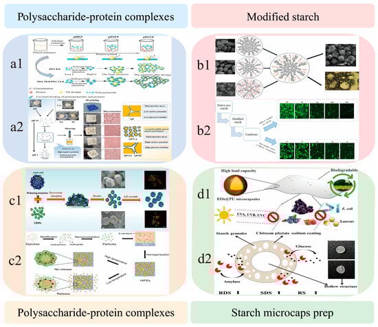 Application model of starch in emulsion system (Reproduced or adapted from [60,61,62,63,64,65,66,67,68,69,70,71], with permission from ELSEVIER Ltd., 2025.). (a1): Schematic of the preparation process for peanut protein sediment-based emulsions under an alkaline environment (pH 8.0–12.0). (a2): Mechanistic diagram illustrating the effect of PEC (polysaccharide–protein complex) concentration on the stability of the interfacial layer in peanut protein emulsions. (b1): Flowchart of the Pickering emulsion preparation process using lauric acid-modified starch particles. (b2): Schematic of the microstructure and stability maintenance of HIPEs (high internal phase emulsions) stabilized by starch-based CSNPs. (c1): Schematic of electrostatic adsorption, self-assembly, and multiscale characterization (SEM & fluorescence imaging) of lauric acid-modified Pickering emulsions with CSNPs. (c2): Flowchart of temperature-responsive HIPE preparation via starch hydrophobic modification and nanoprecipitation, illustrating β-carotene encapsulation and release mechanisms. (d1): Flowchart of the preparation process for starch–chitosan phytate composite-coated microcapsules. (d2): Schematic of the antibacterial properties of EOs@PU microcapsules and their amylase-responsive controlled release mechanism.