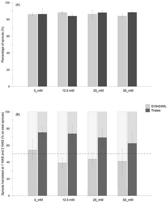 (A) Total percentage of sprouts obtained from seeds of two melon Cultivars (SV9424ML and Thales) harvested at 1 and 2 weeks after sowing (WAS) and subjected to different Salt levels during sprouting (0_mM, 12.5_mM, 25_mM, and 50 mM, respectively). In (B), the contribution of each harvest date—expressed as the percentage of sprouts harvested at 1 WAS (solid-filled charts) and 2 WAS (forward-slash-filled charts)—is reported.