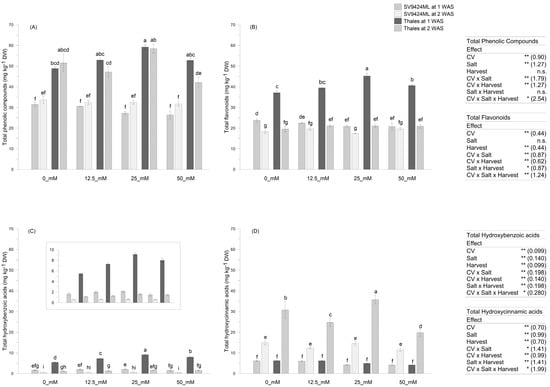 Phenolic compounds (mg kg−1 dry weight, DW) as observed in sprouts of two melon Cultivars (SV9424MLand Thales) subjected to different Salt treatments during sprouting (0_mM, 12.5_mM, 25_mM, and 50 mM). Sprouts were harvested (Harvest) at 1 week after sowing, WAS (solid-filled bars), and at 2 WAS (slash-filled bars)—were sampled. (A) Total phenolic compounds; (B) total flavonoids; (C) total hydroxybenzoic acids; (D) total hydroxycinnamic acid. Data represent means ± standard errors (n = 4). In the boxes, the results of the three-way ANOVA (degrees of freedoms: Cultivar, 1; Salt, 3; Harvest, 1; Cultivar × Salt, 3; Cultivar × Harvest, 1; Cultivar × Salt × Harvest, 3; residues, 48); n.s. not significant; * p < 0.05; ** p < 0.01; numbers on the brackets represent the standard errors of the differences between means (s.e.d.). Lowercase letters indicate significant differences in the Cultivar × Salt × Harvest interaction at p < 0.05 (Fisher’s Least Significant Difference, LSD).