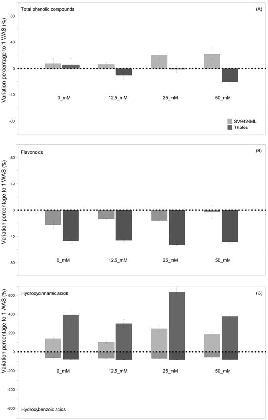 Variation percentage (%) of the single classes of the investigated phenolic compounds as recorded at the second harvest date (2 weeks after sowing, WAS) to the first one (1 WAS) values (dotted horizontal lines). Figures concern the following: (A) total phenolic compounds; (B) total flavonoids; (C) total hydroxybenzoic acids (lower half) and total hydroxycinnamic acids (upper half). Phytochemicals were analyzed from sprouts of two melon Cultivars (SV9424ML and Thales) subjected to different Salt treatments during sprouting (0_mM, 12.5_mM, 25_mM, and 50 mM).