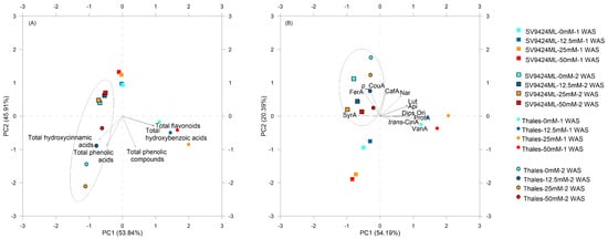 In PCAsingle, PCs (mainly PC2) clustered significantly by Harvest (1 WAS: gray circle; 2 WAS: dark circle), but the other effects were more complex to interpret. Higher factor loadings on PC1 were recorded for protocatechuic acid, vanillic acid, orientin, and diosmetin (0.98, 0.94, 0.89, and 0.89, respectively), which were related to higher content in Thales-25mM-1WAS (Figure 4B). Moreover, Thales-25mM-2WAS was characterized by higher factor scores on PC2 (1.24) related to higher p-coumaric acid content (Figure 4B).
