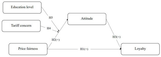 Figure 1 illustrates the research model using five attributes: price fairness (independent variable), attitude (mediator), loyalty (dependent variable), tariff concern (moderating variable), and education level (moderating variable). It shows that price fairness has a positive impact on both attitude and loyalty. Attitude is positively associated with loyalty. Moreover, this research proposed the significant moderating roles of tariff concern and education level on the effect of price fairness on attitude.