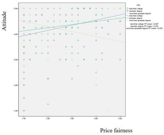 With respect to tariff concerns, the findings indicated that consumers experiencing higher levels of anxiety related to tariffs responded more sensitively to perceptions of price fairness. Specifically, these individuals exhibited more favorable attitudes when egg prices were perceived as stable, suggesting that price stability serves as a psychological buffer against tariff-induced uncertainty. It can be inferred that consumers’ perceptions of eggs as a necessity good may lead to varying effects of price attitudes influenced by concerns over tariffs. In other words, anxiety regarding tariffs can be inferred to act as a key factor shaping consumer behavior. The study also identified a significant moderating effect of education level on the relationship between price fairness and consumer attitudes. Consumers with lower educational attainment were more reactive to perceptions of price fairness, whereas those with higher education levels demonstrated a greater capacity to contextualize price fluctuations within broader structural and economic frameworks. This suggests that higher educational attainment may mitigate anxiety related to price volatility by enhancing consumers’ understanding of market dynamics. Conversely, individuals with limited access to or understanding of such information may experience elevated sensitivity to pricing concerns—a pattern supported by the data.