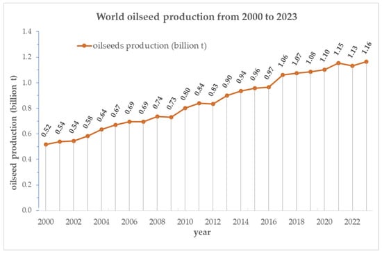 Global oilseed production continues to expand, reaching 1.132 billion tons in 2022 and 1.163 billion tons in 2023. Correspondingly, oilseed cake production increased from 427.249 million tons to 446.568 million tons over the same period [8]. These figures reflect a sustained upward trend in oilseed output, which has more than doubled over the last two decades—from 0.52 billion tons in 2000 to 1.16 billion tons in 2023 (Figure 1). This continued growing is driven by the increasing global demand for vegetable oils and plant-based proteins as well as the strategic role of oilseed crops in advancing sustainable food systems and bioeconomy strategies.