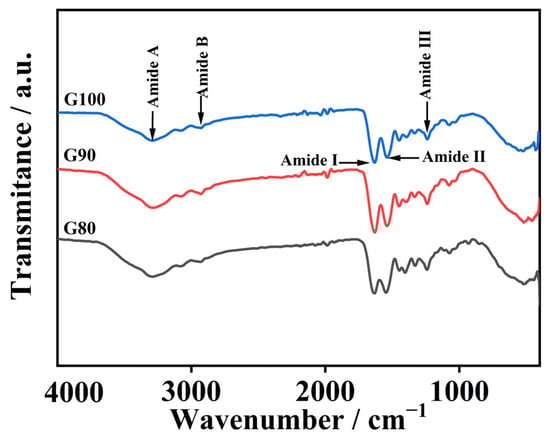 The gelatin amide A band appears at 3284–3293 cm−1 and corresponds to N-H stretching vibrations and hydrogen bonding. Usually, the amide A band usually appears between 3400 and 3440 cm−1, and often moves to lower wavenumbers when N-H groups in peptide bonds are involved in the formation of hydrogen bonds [36]. As temperature rose from 80 °C to 100 °C, the amide A band wavenumber dropped from 3293 to 3284 cm−1, and the degree of degradation of the extracted gelatin increased with increasing temperature. The more obvious the degradation occurs in gelatin, the more free amino groups are released. These free amino groups can react with other groups, causing the amide A band to shift towards a lower wavy number [37]. As the temperature increased, the amide B band changed from 2935 to 2923 cm−1, suggesting the occurrence of interactions between the peptide chains and the NH3 or CH2 groups [34].