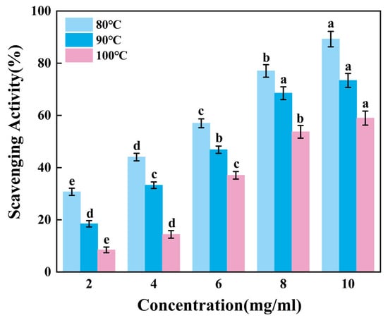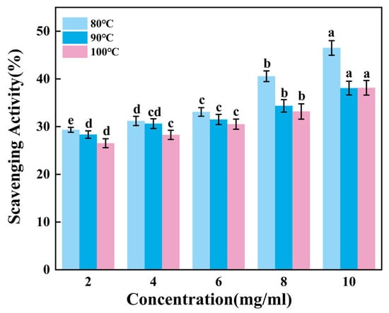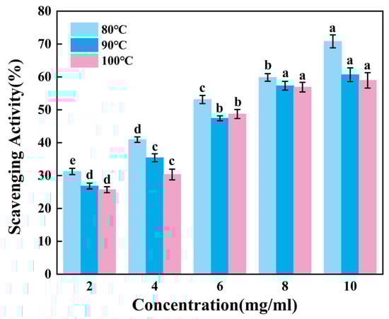 According to Figure 5, the ability of gelatin to scavenge ABTS radicals increases extremely significantly as the sample concentration rose (p < 0.01). Within the sample concentration range of 2–6 mg/mL, the scavenging efficiency of G90 shows no significant change (p > 0.05). As the concentration increases from 8 mg/mL to 10 mg/mL, the scavenging efficiency of G80 significantly improves, while the scavenging efficiencies of G90 and G100 show no significant changes. It can be inferred that gelatin has a relatively weak ability to scavenge ABTS free radicals, and the improvement in scavenging ability is limited when the concentration increases. Additionally, this ability may further weaken as the extraction temperature increases.