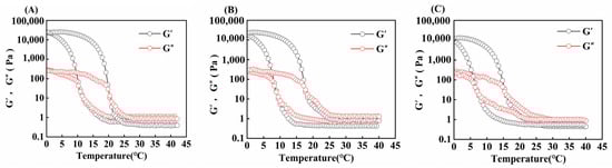 The gel and melting points of gelatin were determined by monitoring shifts in its storage and loss modulus with temperature. And the adopted temperature control system is Peltier system. The parameters of the rheometer (Discovery HR-2, TA Instruments Co., Ltd., New Castle, DE, USA) were as follows: oscillation frequency, 1 Hz; strain, 1%. Place the sample at 40 °C for 1 min before starting the test, the scanning temperature is decreased from 40 °C to 0 °C and then increased from 0 °C up to 40 °C, the rate of temperature change during this process is 2 °C/min.