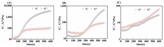 The gelation rates of gelatin obtained from three different extraction temperatures were compared via time scanning. As shown in Figure 7, initially, the G′ of the gel sample was smaller than the G″, and with increasing time, the G′ of the gel sample increased rapidly, and then, the intersection of G′ and G″ appeared, which was the time required for the gel formation of skipjack tuna bone gelatin at 4 °C. At this time, the sample changed from a liquid form to a solid-like form, a denser and more elastic network formed inside the gelatin, and the elastic properties of the gelatin increased [50].