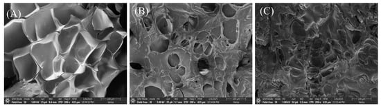 Microstructure of skipjack tuna bone gelatin extracted at 80 °C (A), 90 °C (B), and 100 °C (C).