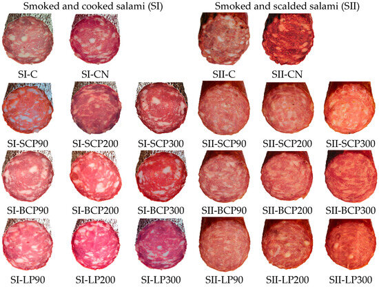 Salami formulas after 30 days of cold storage. SI-C, SII-C: Nitrite-free SI and SII salami; SI-CN, SII-CN: SI and SII salami with added sodium nitrite; SI-SCP90, SI-SCP200, SI-SCP300, SII-SCP90, SII-SCP200, SII-SCP300: Nitrite-free SI and SII salami with sour cherry powder added to provide a TPC of 90, 200 and 300 mg GAE/kg of meat; SI-BCP90, SI-BCP200, SI-BCP300, SII-BCP90, SII-BCP200, SII-BCP300: Nitrite-free SI and SII salami with blackcurrant powder added to provide a TPC of 90, 200 and 300 mg GAE/kg of meat; SI-LP90, SI-LP200, SI-LP300, SII-LP90, SII-LP200, SII-LP300: Nitrite-free SI and SII salami with lingonberry powder added to provide a TPC of 90, 200 and 300 mg GAE/kg of meat.