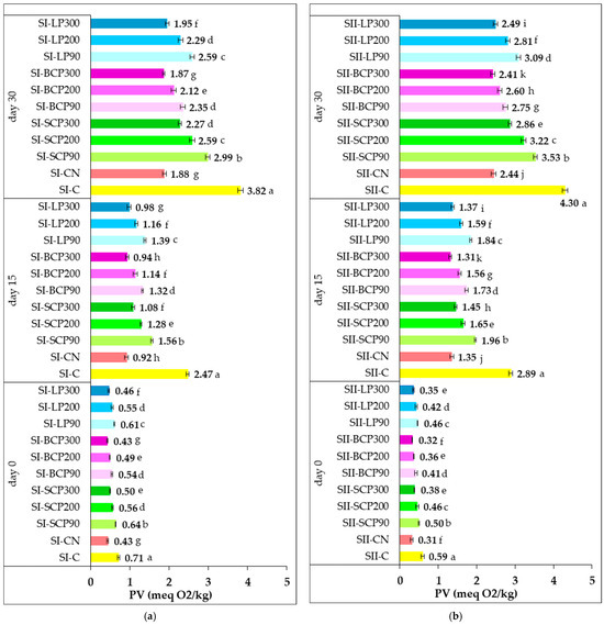 To assess the extent of primary lipid oxidation in salami samples, peroxide value (PV) was determined. This indicator quantifies the concentration of hydroperoxides generated during the initial oxidation stage. The analysis followed the iodometric method [42] and was performed on the lipids extracted from salami samples with a mixture of chloroform and methanol (2:1, v/v) following the procedure described by Seo et al. [43]. PV was reported as milliequivalents of active oxygen per kilogram of lipid.