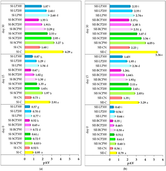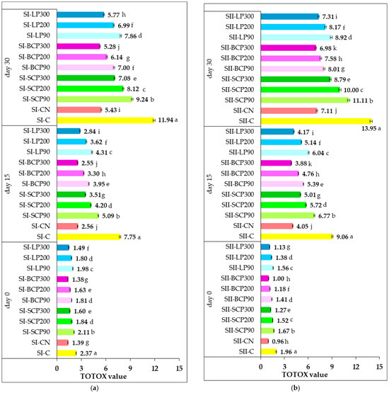 Based on the findings of a previous study [2], the simultaneous assessment of both primary and secondary markers of lipid oxidation is considered more effective for a comprehensive understanding of oxidative deterioration. This dual approach provides insight into the overall extent of oxidation by including the accumulation of secondary oxidation products alongside the oxidative status indicated by primary species. The TOTOX value was calculated by combining the peroxide value (PV) and the para-anisidine value (pAV), according to Equation (4) [46].