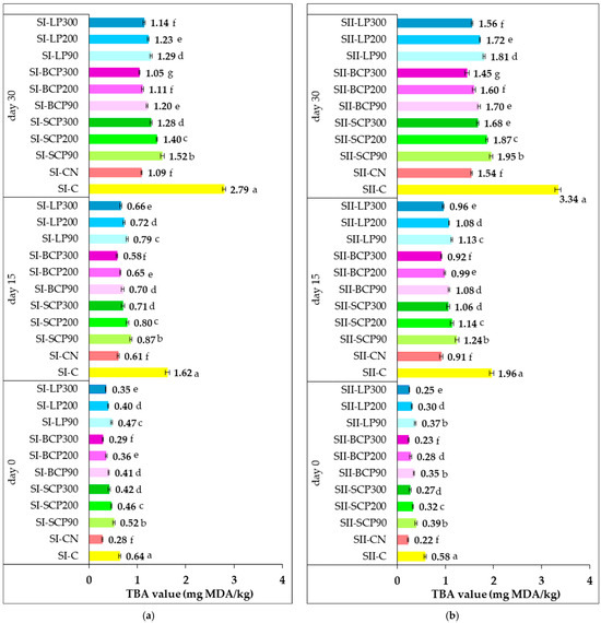 The salami samples from day 0 were tested for proximate chemical composition and lipid oxidation, while samples taken after 15 and 30 days of storage were tested to assess the progression of lipid oxidation based on specific chemical indices, such as the peroxide value (PV), para-anisidine value (pAV), and thiobarbituric acid value (TBA). The total oxidation value (TOTOX) and oxidation inhibition (IO, %) were also calculated.