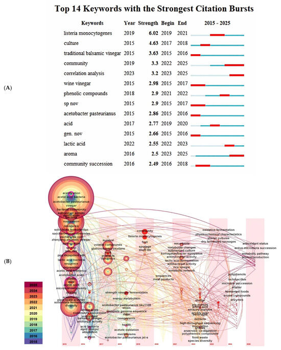 Fermentation constitutes the core microbial bioconversion process in cereal vinegar production, encompassing three critical stages: starch saccharification, alcoholic fermentation, and acetic acid fermentation [127]. The diversity of microorganisms and their dynamic alterations have a significant impact on the quality and characteristics of products during the fermentation process [128]. As shown in Figure 2A,B, through Citespace cited literature clustering and comprehensive analysis of cited literature, In SCI database TS = ((vinegar) AND (bacteria) AND (Organic acid) OR (vinegar) AND (fungus) AND (Amino) acids) OR (vinegar) AND (microbial) AND (flavor)). It can be seen from Figure 2A that 14 key words were summarized during the period from 2015 to 2025. In the recent five years high frequency keywords for listeria monocytogenes, community, and the correlation analysis, phenolic come, acid, lactic acid and aroma. Figure 2B shows the distribution of each keyword in different time regions. In 2025, the research will mainly focus on antioxidant status, active microbiota success, etc. The key words such as acetification and vinegar have all been studied in the past decade.