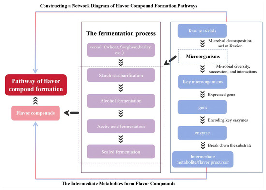 Figure 3 summarizes current methodologies for elucidating flavor compound formation pathways. Fermentation is the process in which microorganisms decompose the matrix in raw materials into various flavor substances. The microbial community of fermentation has a significant impact on the synthesis of flavor substances. The metabolic pathways of different microbiota, microbiota diversity and microbiota interactions will ultimately affect the flavor characteristics. Analysis of microbial community dynamics during fermentation reveals stage-specific microbial succession and its correlation with flavor formation [140]. Microorganisms regulate enzymes through genes to form flavor substances. The functional genes of microorganisms were annotated, the enzymes related to flavor formation were screened, and the functional microorganisms related to flavor formation and substrate degradation in the fermentation process were identified. The pathways of flavor formation were further analyzed, and the metabolic network of flavor compounds was constructed [72].
