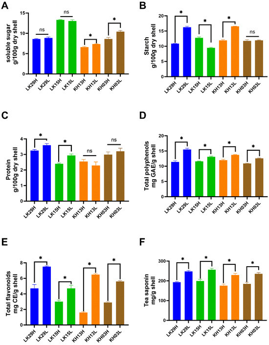 Effect of altitude on the chemical composition of mature fruit shells of C. chekiangoleosa (dried weight). (A) Soluble sugar content; (B) starch content; (C) protein content; (D) total polyphenols; (E) total flavonoids; and (F) tea saponin. Note: One-way ANOVA was used to compare the differences between mean values (p < 0.05); the figures show the results within the same asexual lineage. “*”: p < 0.05; “ns”: p > 0.05.