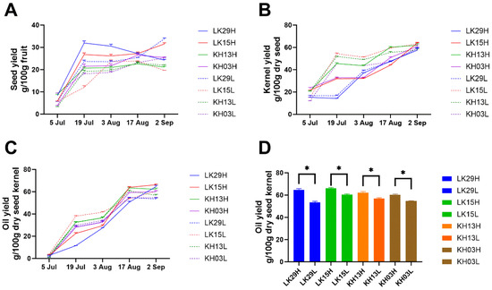 Effect of altitude on seed yield (A), seed kernel yield (B), and oil yield (C) during the ripening of C. chekiangoleosa seeds; (D) the effect of altitude on the oil yield of mature seed. ANOVA was used to compare the differences between mean values (p < 0.05); the figures show the results within the same asexual lineage. “*”: p < 0.05.