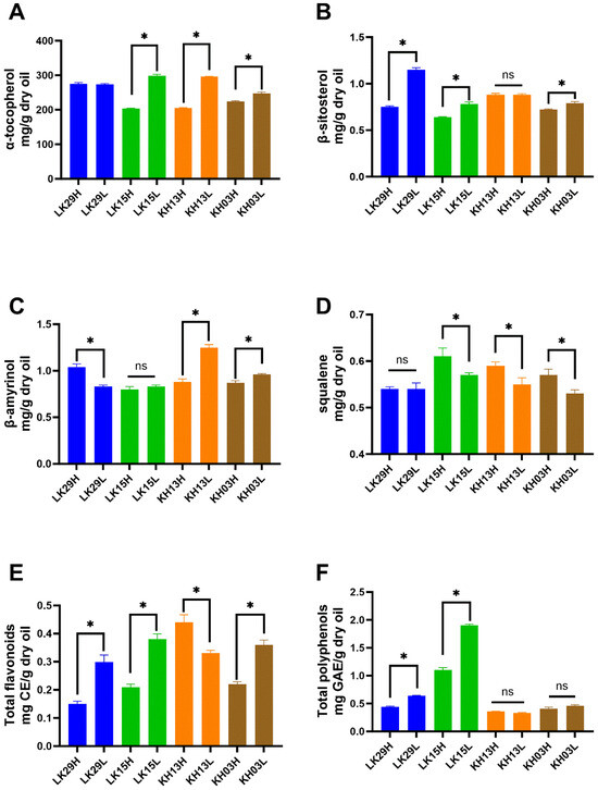 Effect of altitude on lipid concomitant composition of mature seed oils of C. chekiangoleosa. (A) α-tocopherol; (B) β-sitosterol; (C) β-amyrinol; (D) squalene; (E) total flavonoids; and (F) total polyphenols. Note: ANOVA was used to compare the differences between mean values (p < 0.05); the figures show the results within the same asexual lineage. “*”: p < 0.05; “ns”: p > 0.05.