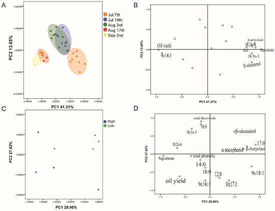 PCA is used to reduce the initial variables to a small part of the principal components in order to obtain an overview of sample variations and identify patterns of behavior. Samples harvested from various harvesting times and different altitudes were used for statistical assessment; the variables comprised fatty acids, oil yield, and lipid concomitants. The loading plot of the first two components for C. chekiangoleosa seed oil samples is presented in Figure 6A. We note that the first two component scores take into account 54.96% (component 1 = 41.31%, and component 2 = 13.65%) of the total variation. The samples from various harvesting times are distributed along the horizontal axis from right to left. Interestingly, component 1 exhibits positive loading mainly with β-sitosterol, squalene, β-amyrinol, 16:0, 18:2 n-6, and 18:3 n-3, and negative loading with oil yield and 9 c18:1 (Figure 6B). This finding showed that oil yield and 9 c18:1 contents increased and β-sitosterol, squalene, β-amyrinol, 16:0, 18:2 n-6, and 18:3 n-3 contents decreased with the development of C. chekiangoleosa seed oil. Another finding is that samples gradually accumulated with the extension of harvesting time, which was significantly observed after 17 August. This suggests that the effects of altitude on seed oils would decrease with the ripening of C. chekiangoleosa.