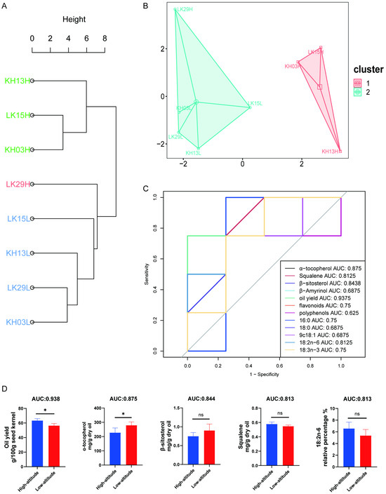 Difference analysis of mature seed oils collected from low- and high-altitude regions; (A) hierarchical clustering; (B) K-means clustering; (C) ROC analysis; and (D) T-test for critical components. “*”: p < 0.05; “ns”: p > 0.05.