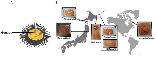 The gonads of two types of sea urchins, Ezobafununi (Strongylocentrotus intermedius, from the four northern islands, Shikotan, Russia) and Kitamurasakiuni (Strongylocentrotus nudus, from Hakodate, Hokkaido, Japan), were purchased from Murakami Shoten, a company located in Hokuto, Hokkaido, Japan. Four other types, including Hokuyobafununi (Strongylocentrotus droebachiensis, from Canada), Bafununi (Hemicentrotus pulcherrimus, from the four northern islands, Russia), farmed Bafununi (Hemicentrotus pulcherrimus, from Hamanaka, Hokkaido, Japan), and Murasakiuni (Heliocidaris crassispina, from Matsushima, Miyagi, Japan), were purchased from Yoshizen, a company located in Toyosu, Tokyo, Japan. All the samples and their collected locations are shown in Figure 1. The gonads of Ezobafununi, Bafununi, and Hokuyubafununi were female, whereas Kitamurasakiuni and Murasakiuni were male. Harvesting seasons for sea urchins vary from country to country, but in Japan, summer is the most common season to harvest sea urchins. However, for our study, the samples were collected in winter (February 2024). All the collected samples were fresh and stored at −80 °C until the analysis.