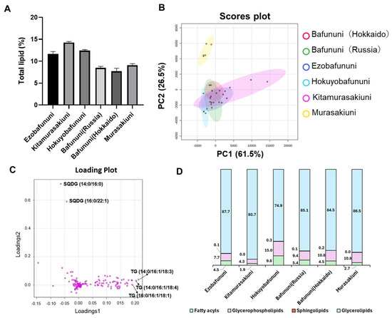 (A). Percentage of total lipids per fresh weight determined in sea urchins. (B). Principal component analysis (PCA) scores plot of lipid species from six species of sea urchin. (C). Loading plots of lipid species from six species of sea urchins where TGs are the major contributor to group separation (D). Percentage distribution of four lipid classes among six types of sea urchins (sphingolipids, indicated by orange color, are difficult to see in figure due to their very low abundance of <1%).