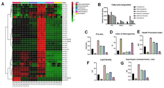 (A). Heatmap of free fatty acids showing concentration variations. (B). Fatty acid composition based on unsaturation in six types of sea urchins. (C). PUFA to SFA (P:S) ratio in sea urchins (D). Index of atherogenicity [IA]. (E). Health promotion index [HPI]. (F). Lipid quality [LQ]. (G). Hypo/hyper-cholesteroleimic ratio [HH ratio].