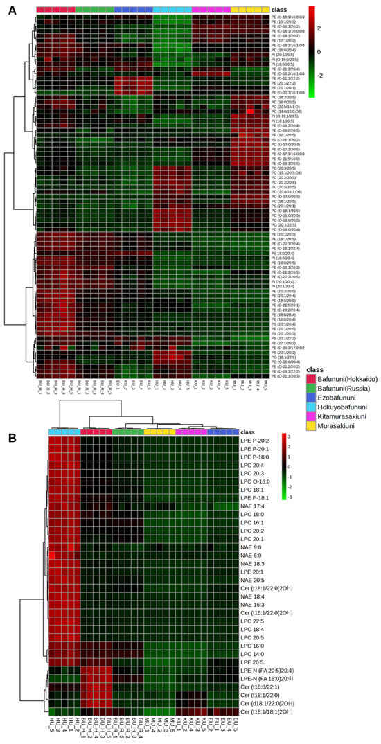 Hierarchical cluster correlation analysis of glycerophospholipids detected in sea urchins. (A). Phosphatidylethanolamine (PE), phosphatidylcholine (PC), and phosphatidylinositol (PI). (B). Lysophospholipids (LPE), lysophophatidylcholine (LPC), N-acyl-lysophosphatidylethanolamine (LPE-N), N-acyl ethanolamines (NAEs), and ceramides (Cer).