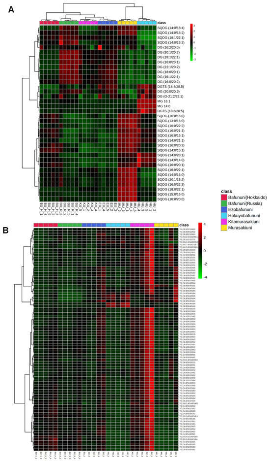 Hierarchical cluster correlation analysis of glycerolipids detected in sea urchins. (A). Sulfoquinovosyl diacylglycerol (SQDG), monoacylglycerol (MG), and diacylglycerol (DG). (B). Triacylglycerol (TG).