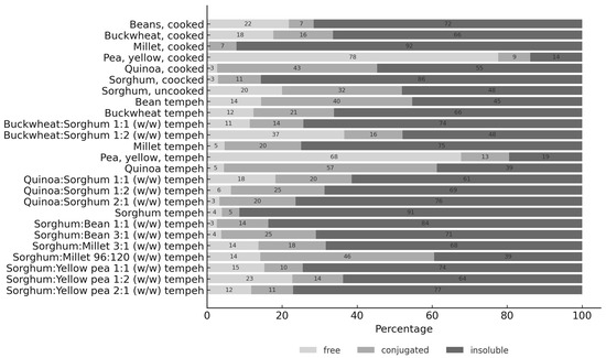The raw materials with the highest total phenolic acid (TPA) content were millet (179.2 µg/g TPA), quinoa (176.9 µg/g TPA), yellow pea (164.5 µg/g TPA), and sorghum (130.4 µg/g TPA). As shown in Figure 1, the highest concentrations of free phenolic acids were found in cooked yellow pea (127.7 µg/g, representing 78% of total PA), buckwheat:sorghum (1:2) tempeh (75.5 µg/g, 37% of TPA), and yellow pea tempeh (59.5 µg/g, 68% of TPA). Conjugated phenolic acids were most abundant in the quinoa tempeh (127.7 µg/g, 57% of TPA), cooked quinoa (75.5 µg/g, 43% of TPA), and quinoa:sorghum (2:1) tempeh (59.5 µg/g, 20% of TPA). The materials with the highest levels of insoluble phenolic acids were quinoa:sorghum (2:1) tempeh (223.9 µg/g, 76% of TPA), sorghum:yellow pea (2:1) tempeh (214 µg/g, 77% of TPA), and buckwheat:sorghum (1:1) tempeh (201.5 µg/g, 74% of TPA).