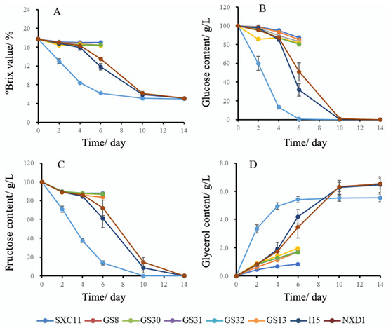 Figure 3. Changes in °Brix, glucose, fructose, and glycerol during fermentation of 8 yeast strains: (A) °Brix; (B) glucose; (C) fructose; (D) glycerol.