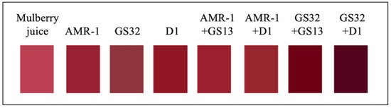 These strains were further tested for making mulberry wine. The fermented and aged wines were evaluated for color preservation, anthocyanin stability, and other important physical and chemical properties (Table S3). The parameter changes in mulberry juice and mulberry wine CIELAB are shown in Table S4. L* indicates the color brightness of mulberry wine, and the larger the value, the brighter the color. After fermentation, compared with mulberry juice, the L* value of mulberry wine decreases, and the brightness decreases. a* indicates the reddish-green degree of mulberry wine, and the larger the value, the more red color. Only the a* of GS32 + D1 group in mulberry wine has a significant difference with mulberry juice. b* represents the degree of yellow blue of mulberry wine, and the larger the value, the more yellow hue. In the treatment group, only the b* value of the GS32 + D1 group decreased, the blue hue increased, and the b* value of the other groups increased. Figure 4 more intuitively shows the results of Table S4, GS32 + D1 group mulberry wine color is a darker, darker purple.
