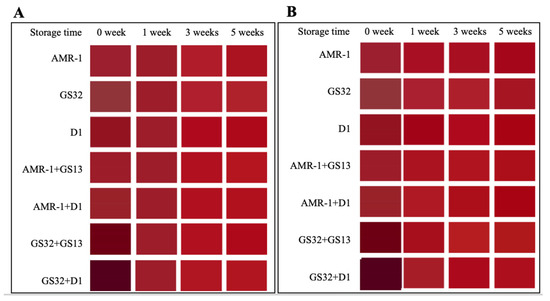 Fruit wine aging is an important part of the process of fruit wine brewing, which plays an important role in the quality of fruit wine. In this experiment, mulberry wine was aged under the conditions of 17 °C, 22 °C, and 37 °C, and the changes in CIELAB parameters of mulberry wine were observed, respectively (as shown in Table S5). Under the condition of 17 °C, L*, a*, b*, C*, and H* values of mulberry wine increased from 0 to 1 week of aging; that is, color brightness increased, purple hue weakened, red hue enhanced, yellow hue enhanced, color saturation and gloss enhanced. With the extension of aging time, the CIELAB parameters of each treatment group did not change significantly. The variation in parameters under condition 22 °C is similar to that under condition 17 °C. The color of mulberry wine aged for 1 week under the condition of 22 °C (Figure 5B) was close to that aged for 3 weeks under the condition of 17 °C (Figure 5A), and there was no significant change in the color of mulberry wine in each treatment group with the extension of aging time. Under 37 °C accelerated aging (Figure 5C), the L* value and brightness of mulberry wine decreased after 5 weeks of aging, except for the GS32 + D1 group; The a* value increased, and the red hue increased. The b* value increased, and the yellow hue increased. It may be that the yeast strains that are high in pyruvate acid and acetaldehyde convert with monomer anthocyanins to vitisins with orange hues, resulting in a change in color.