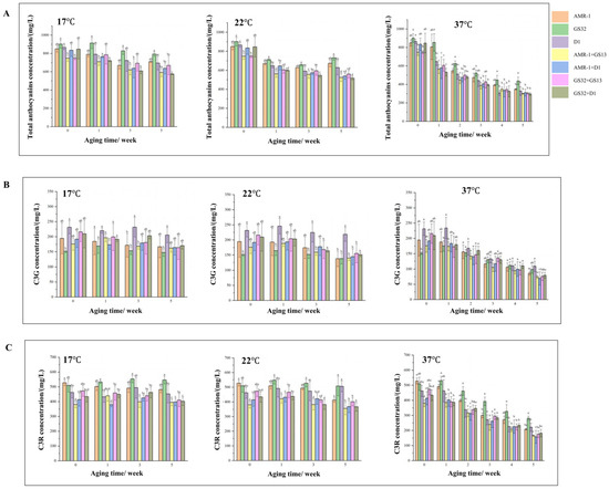 Figure 7. Changes in total anthocyanins, C3G, and C3R in mulberry wine during aging: (A) changes in total anthocyanins in mulberry wine at 17 °C, 22 °C, and 37 °C during aging; (B) changes in C3G in mulberry wine at 17 °C, 22 °C, and 37 °C during aging; (C) changes in C3G in mulberry wine at 17 °C, 22 °C, and 37 °C during aging. Different letters indicated significant differences in the index, p < 0.05.