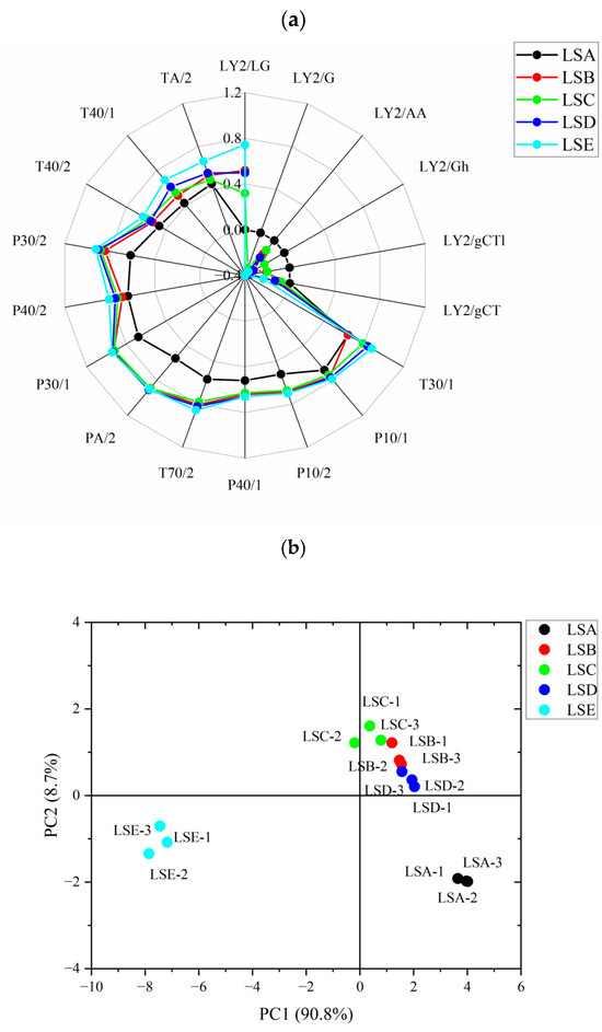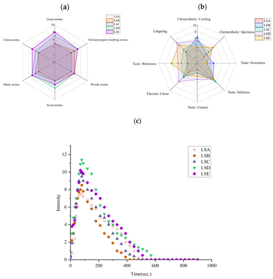 The key aroma attributes of whole Hui Li red Sichuan peppers were defined by 10 trained panellists as green, citrus, minty, sweet, woody, and Sichuan pepper numbing. The perceived intensity of these aroma attributes for pepper samples is illustrated in Figure 1a. Specifically, LSA (late July harvest) sample received the highest perceived intensity for woody aroma, the LSD (early September harvest) sample was characterised by a higher perceived intensity for sweet aroma, and LSE (late September harvest) exhibited higher perceived intensities for green, citrus and fresh aroma. Both minty and pepper-numbing aromas were equally prominent in the LSD and LSE samples as they received the highest intensity ratings compared to those pepper samples harvested before September. Clearly, the variations in aroma attributes across harvest times for whole Hui Li red Sichuan peppers suggest that differences in maturity levels may influence the biosynthesis of volatile compounds, as developmental changes in peppers can affect the pathways responsible for aroma compounds production [25].