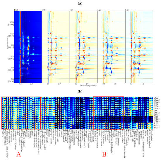 Representative GC-IMS plots of individual volatile compounds detected in Hui Li red Sichuan peppers harvested at five selected time periods: (a) 2D topography plot with differential comparison mode; (b) gallery plot of signal peak areas of individual volatile compounds. Volatiles in region A consistently exhibited high abundance across all harvesting times, indicating they were not affected by the harvest time. Volatiles in region B showed an increasing trend in abundance during the first three harvest periods (LSA, LSB, and LSC samples, from late July to late August 2022), followed by a sharp decrease at the 4th harvest (LSD sample, early September 2022) and a subsequent increase at the 5th harvest (LSE sample, late September 2022).