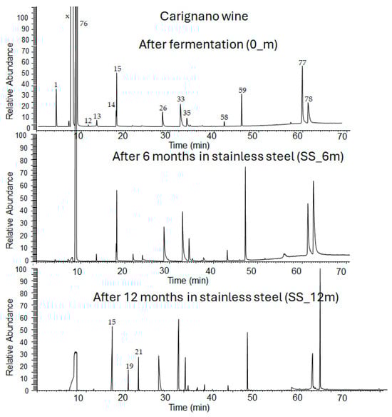 The detected compounds changed in number, type, and amount at the different collecting times and aging technologies (Figure 1). After the fermentation step, 31 compounds were detected, whereas after six months, between 34 and 38, and at 12 months, between 62 and 66.