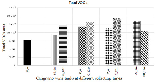 The total concentration of VOCs (volatile organic compounds) at different collecting times showed an increase in all containers after six months. At 12 months, plastic vats had the highest increase (p < 0.05), followed by concrete and stainless steel, whereas oak barrels had a decrease in the total concentration of VOCs (Figure 2 and Figure 3).