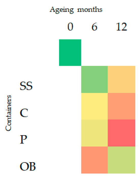 The decrease in the alcohol group in all containers between 6 and 12 months was related to the increase in the ester group, with aroma compounds associated with fruity profiles (Table S3) [35]. These data agree with previous studies on Cabernet Sauvignon aged in oak barrels regardless of the type of the barrel [36].