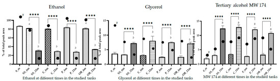 Column plots showing the relative abundance (%) of ethanol, glycerol, and MW174 in Carignano wine samples across different aging stages and storage container types. Significance differences among columns: **** p < 0.0001; different letters denote statistically significant differences over time: (a) 0_m vs. T_6m, (b) 0_m vs. T_12m (p < 0.05). y absolute abundance in the analytical extract.