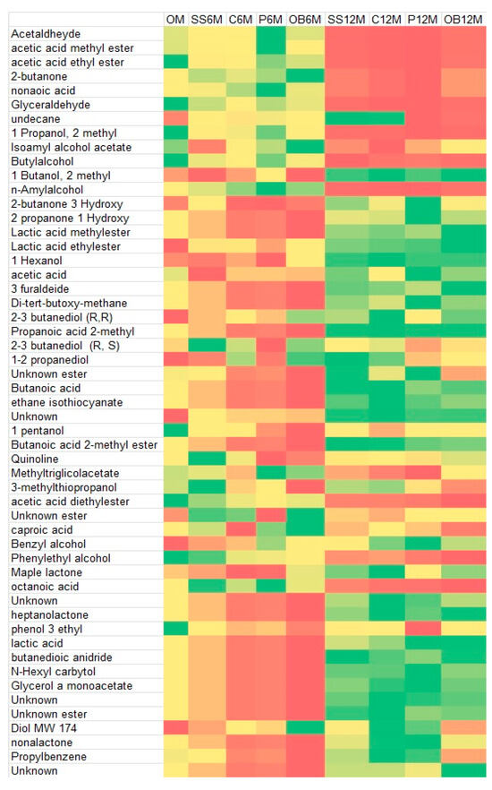 Heatmap of main VOCs at different aging times (0, 6, 12 months) and in the different containers: stainless-steel (SS), concrete (C), plastic (P), oak barrel (OB). The green zone represents more concentrated compounds, whereas the red zone represents less concentrated.
