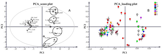 PCA score plot (A) and loading plot (B) of wine aging. In the score plot, the confidence interval is defined by Hotelling’s T2 ellipse (95% confidence interval).
