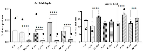 Column plots showing the abundance of acetaldehyde and acetic acid in Carignano wine samples aged for 6 or 12 months in different containers. Differences were tested using Tukey’s post hoc test. *** denotes p < 0.001 **** denotes p < 0.0001. Different letters indicate statistically significant differences (p < 0.05) between aging times within each container type. y absolute abundance in the analytical extract.