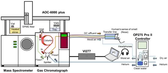 Odor-active compounds were characterized using a sniffing port (OP275 Pro II, GL Sciences, Tokyo, Japan) coupled with the GC system. As depicted in Figure 2, the samples separated by the capillary column were split at the column outlet. One branch (Flow 1) was directed to a gas chromatograph equipped with a mass-spectrometry detector for structural identification, while the other branch (Flow 2) was carried away from the gas chromatograph by auxiliary gas (Helium) to a sniffing port and evaluated using a human’s sense of smell (nose). To prevent nasal mucosa drying and to mitigate its negative effect on sensory perception during prolonged GC-MS-O analysis, the moist air generated in a bubbling bottle was introduced at the nose cone flange. The GC-MS conditions were consistent with those previously described. An olfactory voicegram device, consisting of an olfactory voicegram interface (VI277, GL Sciences, Tokyo, Japan) and a set of USB headphones, was used to record the names and details of odors alongside the chromatogram.